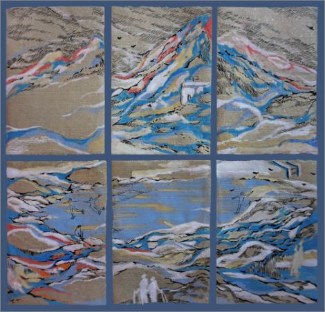 В творбите на Рада Цанкова планините не са само релеф. Ако се вгледате, ще откриете „висящи души“ - фигури на дервиши, търговци, деца и въжеходци, които обитават нейните „миражи“. Това е свят на метаморфози: планинският склон внезапно се превръща в човешко лице, а синята боя прониква в хартията като метеорологичен феномен.