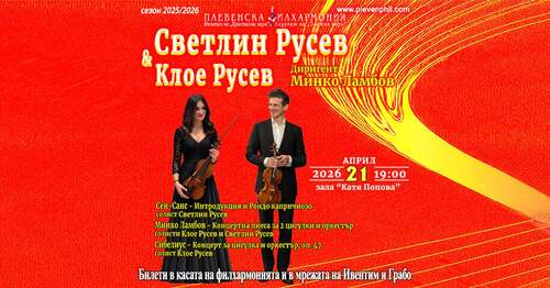 Тази вечер, 21.04., от 19:00 часа, в концертна зала "Катя Попова", Плевен ще бъде първия оркестров концерт, на който маестро Светлин Русев ще застане на една сцена с оркестър рамо до рамо с неговата 21-годишна талантлива дъщеря Клое Русев, също цигуларка със завидна за крехката си възраст кариера. Концертът е своеобразен връх на личния музикален маратон за маестро Русев. За представяне на Клое в България на професионална сцена, той се е доверил на оркестъра на Плевенска филхармония с концертмайстор Чавдар Вълков. Диригент, а и композитор на концерта ще бъде маестро Минко Ламбов.