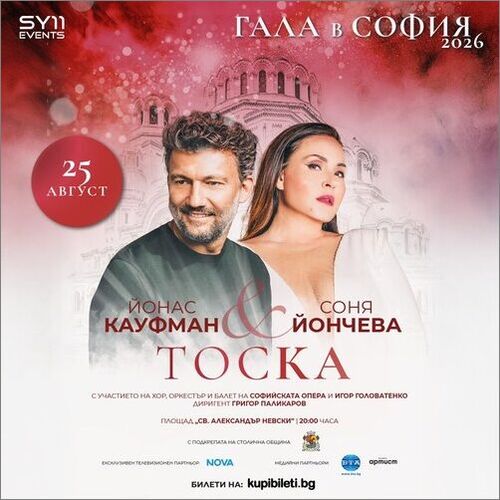 Звездният тенор Йонас Кауфман ще се изяви като Марио Каварадоси редом с българската оперна прима Соня Йончева в ролята на Тоска и нашумелия по световните сцени баритон Игор Головатенко като Скарпия в полуконцертна версия на шедьовъра на Пучини на 25 август на площад „Свети Александър Невски“. Те са звездните гости в първата от двете фестивални вечери на „Гала в София”.