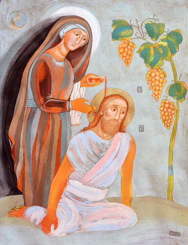 Картините са изцяло на библейска тематика, а свързващата нишка между тях е общението, което постоянно протича между Иисус Христос и нас – човеците. Виждаме го, когато Апостол Петър е здраво хванат от Христос за ръката, докато потъва и в тази хватка е сякаш цялата ни вяра, че не сме сами, че ще бъдем измъкнати, че няма да потънем. На друго място поглеждаме починалата Яирова дъщеря, чиято ръка е нежно хваната от Иисус, Който я възкресява, а в трета картина ще видим устремените един към друг Лазар и Господ Иисус Христос протегнали ръце, за да може Животът да бъде продължен, а смъртта победена. В „Благовещение“ архангел Гавриил подава плахо своето цвете към Богородица с Благата вест, а в „Помазание Христово“ една мироносица облива косите Иисусови с миро и сякаш изплаква греховете си. Общението с Господ е докосване, разговор, очакване, радост, а понякога мълчание и тишина.