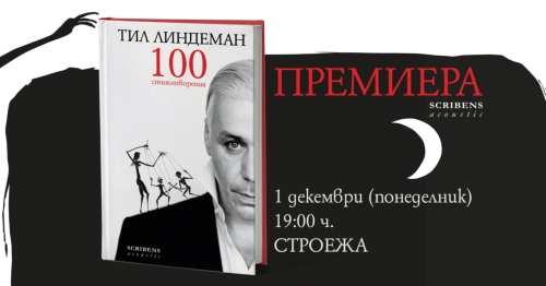 В София предстои още едно събитие, свързано с Тил Линдеман, този път поетично. Издателство „Скрибенс“ ще представи „100 стихотворения“ - последната поетична книга на музиканта. Неговата поезия излиза за първи път на български език в превод на Теодора Гандева и Александра Димитрова, с художествената редакция на Роберт Леви. Снимката на корицата е дело на легендарния музикант и фотограф Bryan Adams.